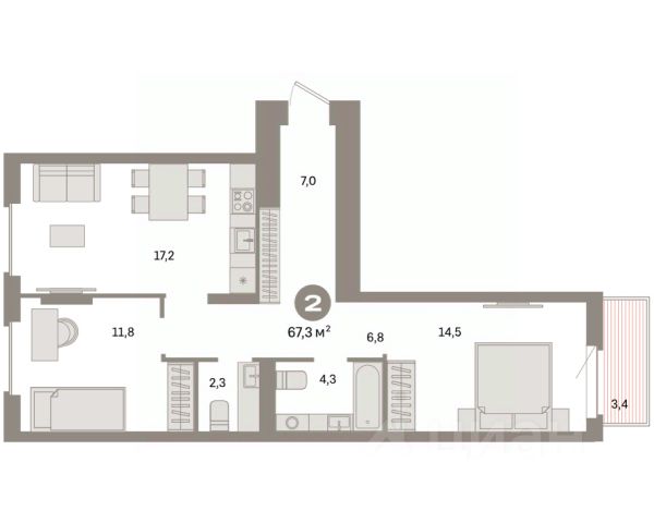 Квартира с кухней-гостиной и одной спальней в квартале "Траектория". Особенности планировки: балкон, вид во двор, предчистовая отделка.