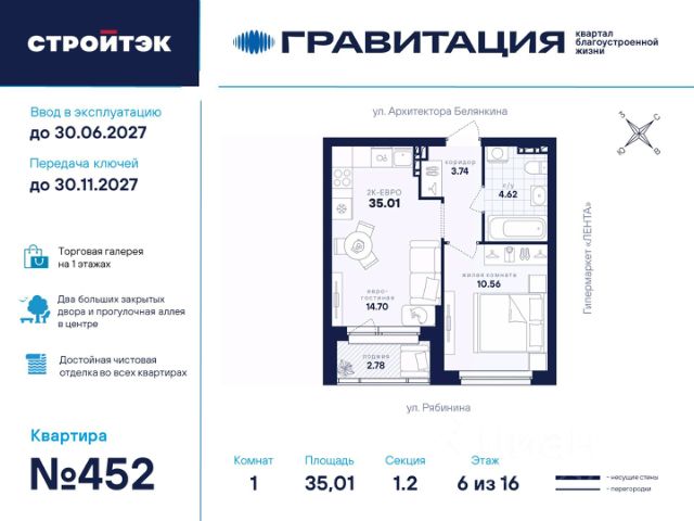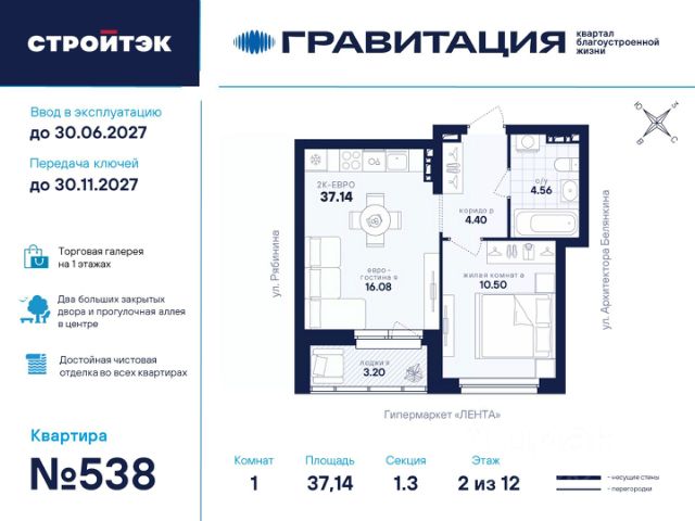 Удачные решения Новый квартал благоустроенной жизни "Гравитация" мы разместили в периметре улиц Рябинина и Академика Ландау. У квартала 5 этапов строительства, а всю работу мы завершим к 2030 году. Авторы проекта гармонично совместили в оформлении природные элементы и современный дизайн. Волнообразные очертания на стенах вдохновлены силой ветра и движением воды. Скруглённые углы подчеркивают элегантный силуэт, а контрастная палитра акцентов и контурная подсветка верхних этажей создают выразительный архитектурный образ. Первый этап строительства: — Секция 1.1 — 1 подъезд 26 этажей — Секция 1.2 — 2 подъезда 16 этажей — Секция 1.3 — 1 подъезд 12 этажей Здесь всё и сразу Гравитация — уютный и обособленный, и в то же время открытый и просторный квартал. Всё рядом: супермаркеты и парки, кино и рестораны, школы и сады. В нескольких шагах набережная реки Патрушихи. В квартале построят муниципальный детский сад на 200 мест, а на 5 этапе строительства мы возведём 6-уровневый надземный паркинг на 250 машин. На первых этажах домов для вас будет работать торговая галерея с магазинами, кафе и привычными бытовыми сервисами. В 1 этапе строительства 631 квартира. Своя вселенная Развитый Академический район удобен и молодым семьям, и школьникам, и состоявшимся профессионалам. Рядом большой Преображенский парк с озером и Юго-Западный лесопарк с Тропой здоровья. — 3 минуты до Гипер Ленты — 10 минут на машине до ТРЦ "Академический", 15 минут до ЕКАД, 25 до центра — 6 школ и 6 детских садов — Спортивные комплексы и клубы Wake up, Bright Fit и Юность Богатые возможности В квартале два просторных закрытых двора общей площадью 1,4 гектара. Один двор объединяет 1 и 2 этапы строительства, другой — 3, 4 и 5 этапы. Между дворами — камерная прогулочная аллея для неспешных вечеров или полуденного отдыха. Во дворе первого этапа — зелёные участки из хвойных деревьев, акцентных кустарников и травянистых многолетников, а также сеть дорожек, детская площадка с песочницей, аттракционами и геопластикой, настольный теннис и зона для зарядки. А для комфорта и безопасности — вечернее освещение, охрана и постоянное видеонаблюдение. Пространство с заботой В просторных светлых лобби Гравитации — интеллигентный дизайн, помещения для колясок, высокие витражи и комфортная мебель. Выходы сквозные, на улицу и во двор. Лифты грузоподъёмностью 1000 и 450 кг. Мы подготовили для вас 44 уникальных варианта продуманных планировок, в том числе с кухнями-гостиными, гардеробными и мастер-спальнями. Здесь нет бесполезных зон, зато есть где посидеть в семейном кругу и разместить всё для удобства и комфорта. Современные технологии Мы позаботились о достойной чистовой отделке, чтобы вы могли уделить время главному. — Виниловые обои на флизелиновой основе, окрашенные стены в санузлах и на лоджиях — Натяжные потолки везде, кроме лоджий, там — окрашенные — Прочный влагостойкий ламинат и керамическая плитка — Межкомнатные двери светлых тонов и сейф-дверь на входе — Эргономичное размещение розеток и выключателей