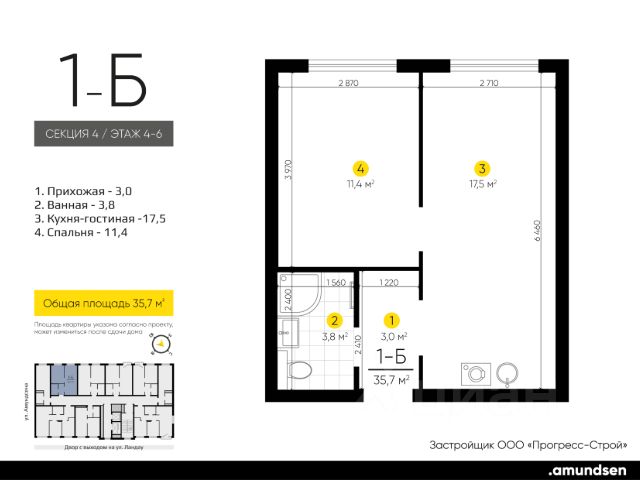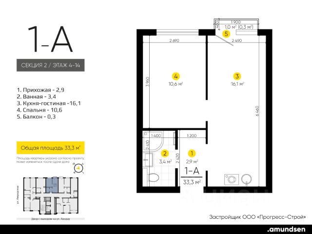 Жилой квартал "Amundsen" - для себя, для семьи, для жизни и развития. Авторская концепция проекта эффектно выделяется в 3 особенностях комплекса: фасады, двор и места общего пользования. AMUNDSEN ПРОЕКТ С ХАРАКТЕРОМ ВЕЛИКОГО ПЕРВООТКРЫВАТЕЛЯ. 4 СЕЗОНА: Двор-трансформер позволяет активно использовать все площадки круглый год. В холодное время года санки, коньки и снежные бои за главную башню. В теплое время источник наполняет двор водой и прохладой. Работают площадки для активных игр и спокойного отдыха. 6 ДЕТСКИХ ПЛОЩАДОК: Мы разделили площадки по возрастным группам для малышей и детей постарше. Качели, аттракционы, водные и активные игры созданы, чтобы познавать мир. 5 ПЛОЩАДОК ДЛЯ СПОКОЙНОГО ОТДЫХА: За счет игры с ландшафтом мы создали приватные зоны, украсили пространство разнотравьем, оживили двор источником. Шум воды, лежаки, беседки, парк места, где ты почувствуешь течение жизни. AMUNDSEN ИДЕАЛЬНОЕ МЕСТО ДЛЯ ЖИЗНИ И РАЗВИТИЯ. - Жилой квартал расположен в экологически чистом районе в окружении двух лесных массивов. - Новые современные школы и детские сады. Спортивный кластер для занятий. - Главный холл пространство для всех. Для самых маленьких игры, для взрослых кафе с ярким дизайном, тихий коворкинг, места для отдыха и светлый, просторный атриум. - Детские площадки "будущего" с оригинальным подходом к созданию игровой среды. - Безопасная территория. Круглосуточная охрана, видеонаблюдение 24/7, электронная система доступа, двор без машин. Застройщик ООО СЗ "Прогресс-Строй", проектная декларация на сайте наш.дом.рф