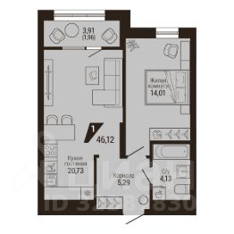 Общая площадь однокомнатной квартиры 38.1 м.кв., кухня- гостинная 16.6 м.кв., жилая 11,8 м.кв., комфортная лоджия 2,8 м.кв., совмещённый санузел 4,3 м.кв., коридор 4 м.кв.