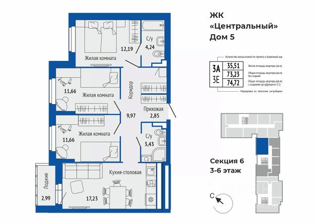 Продаётся 3-комнатная квартира в строящемся доме (ПК 17), срок сдачи: II-кв. 2028, общей площадью 71.6 кв.м., на 4 этаже. Расположение, транспортная доступность