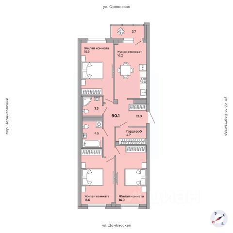 Квартира общей площадью 91,2 кв. м: большая светлая кухня-гостиная - 30,2 кв. м с выходом на лоджию, две спальни - 21 и 16,3 кв. м, прихожая и коридор - 17,2 кв. м, два санузла, кладовая.
