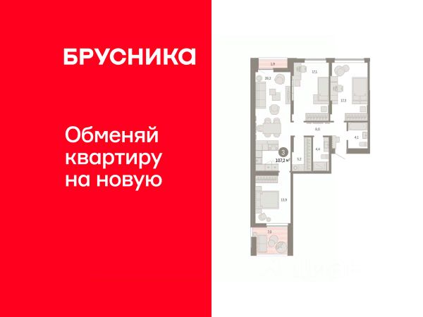 Квартира с кухней-гостиной и тремя спальнями в квартале "Траектория". Особенности планировки: балкон, окна на две стороны, предчистовая отделка, разнесённые спальни, стартовая цена.