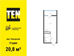 Однокомнатная студия от застройщика с предчистовой отделкой в ЖК "Квартал Траектория" на 11 этаже. Общая площадь: 30.4 кв.м., площадь гостиной 22.1 кв.м., из которых 5 кв.м. выделено под кухонную зону. Все окна выходят на одну сторону. В квартире один балкон, один совмещенный санузел. Высота потолков 2.82 м.