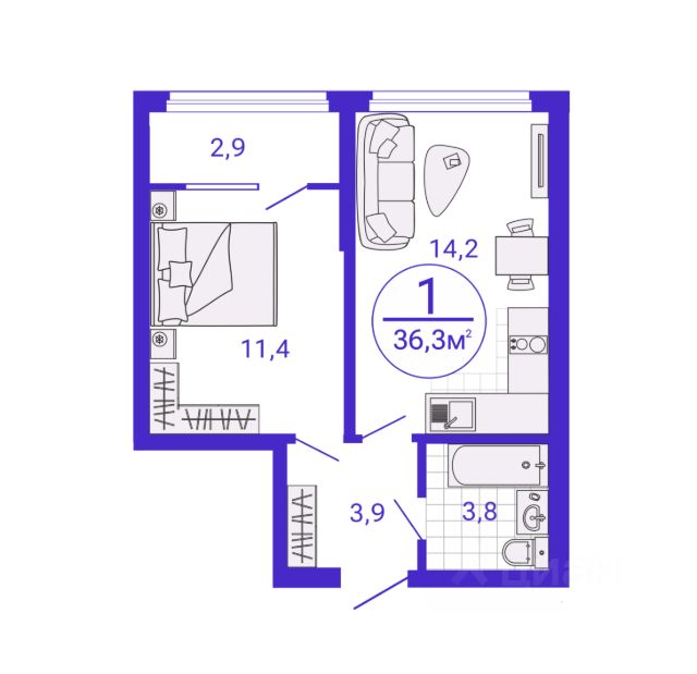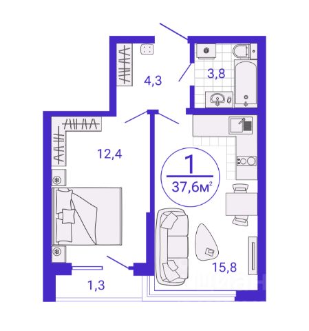 - квартира передается в чистовой отделке, укомплектованной базовым набором мебели и техники, отличается компактной функциональной планировкой, окном увеличенного формата и удлиненной батарей по всей длине оконного проема;