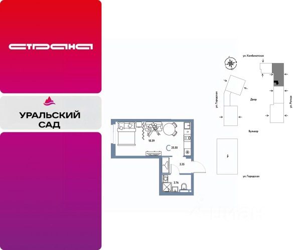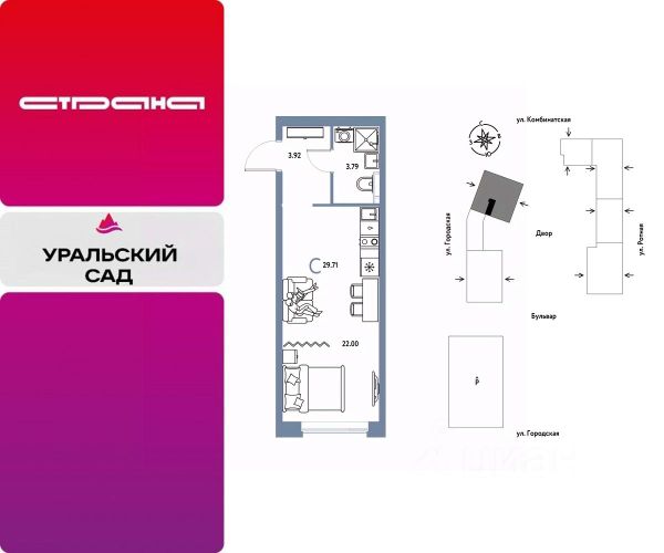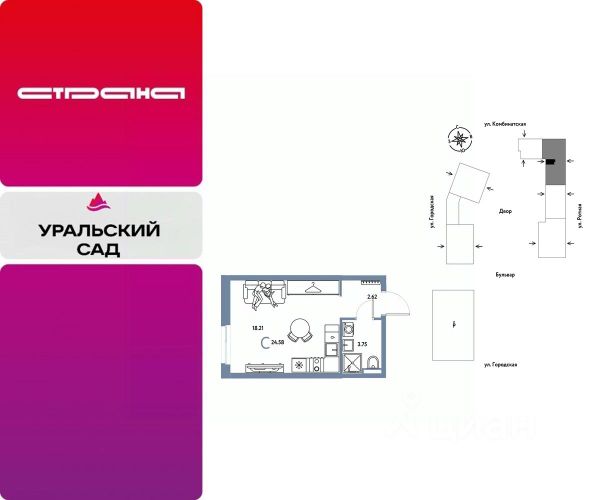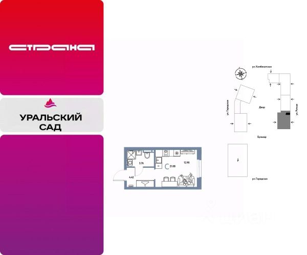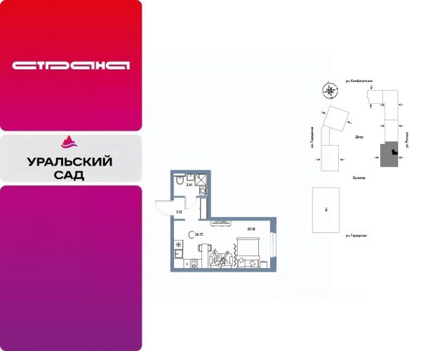 Новая квартира в ЖК "Уральский сад" напрямую от федерального застройщика "Страна Девелопмент". Продается 1комнатная квартира на 11 этаже от застройщика Страна Девелопмент. Площадь квартиры 26,72 кв. м. ЖК "Уральский сад" Жилой комплекс "Уральский сад" — это новый проект ревитализации территории в Екатеринбурге. Основная идея проекта создать комьюнити людей, которые наполняют свою жизнь необходимыми ресурсами и энергией, стремятся созидать, вдохновлять и развивать. 17 жилых домов переменной этажности — это "место силы" для жителей, соединенное с комфортом и умными технологиями. Преимущества • Территория проекта будет условно разделена на 3 зоны: внешнее окружение, общественный бульвар и закрытые дворы. Чтобы создать дополнительный зелёный буффер на общественных пространствах мы высадим полноразмерные деревья. • Особое внимание мы уделили входным зонам с парадными — каждая из них имеет свой уникальный дизайн, гармонирующий с внутридворовым пространством. • Разноуровневые террасы, французские балконы и панорамное угловое остекление — особенность проекта. Архитектурная подсветка акцентно выделяет квартал в локации. Отделка Квартиры сдаются с предчистовой отделкой: произведена разводка электричества и отопления, выполнена стяжка пола, стены выровнены "под маяк", установлены радиаторы. Дизайнерская отделка При покупке квартиры в ЖК "Уральский сад" можно включить стоимость ремонта в ипотеку. 4 стиля отделки ванной и 5 стилей отделки комнат на выбор. Кухня от застройщика Одна из удобных опций от Страны — приобретение кухни в ипотеку при покупке опции "Ремонт". Доступно 4 стиля на выбор: дерево, керамика, мрамор, бетон. Умный дом Система "Умный дом" создаст новый уровень комфорта. Управление светом с помощью голоса, получение последней информации о ситуации в квартире во время отпуска или рабочего дня — и другие преимущества включены в пакет. Способы покупки Сотрудники "Страна Девелопмент" будут сопровождать вас на каждом этапе сделки, помогут получить одобрение по ипотеке или снизить ежемесячный платеж. - ипотека - рассрочка - с использованием материнского капитала -100% оплата наличными