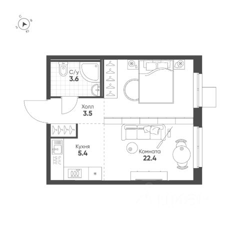 Общая площадь составляет 57,2 квадратных метров, включая две комнаты площадью 10,30 и 10,20 кв. м., кухню-столовую 18,90 кв.м., совмещённый санузел - 4,40 кв. м., санузел - 1,80 кв. м., коридор - 11,60 кв.м; высота потолков достигает 2,72 метра. Внутренняя отделка предусматривает подготовку стен и полов перед финишной отделкой. Из окон открывается вид на променадную улицу.