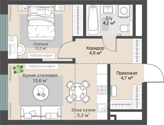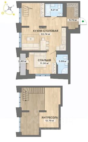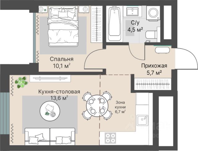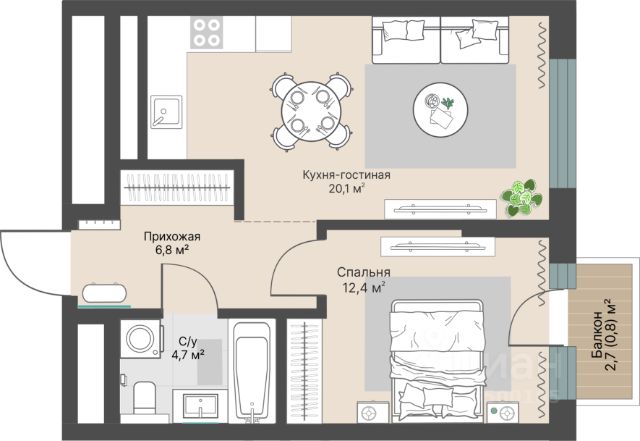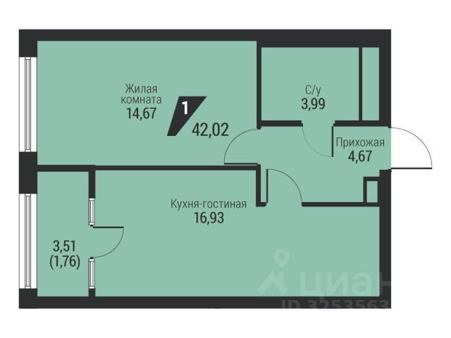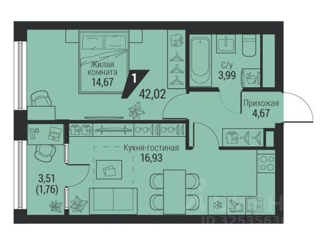 Квартира площадью 43, 2 кв. м., находиться на 9 этаже 23 этажного дома. Жилая площадь - 11, 20 кв. м.; кухня - гостиная -18, 5 кв. м.