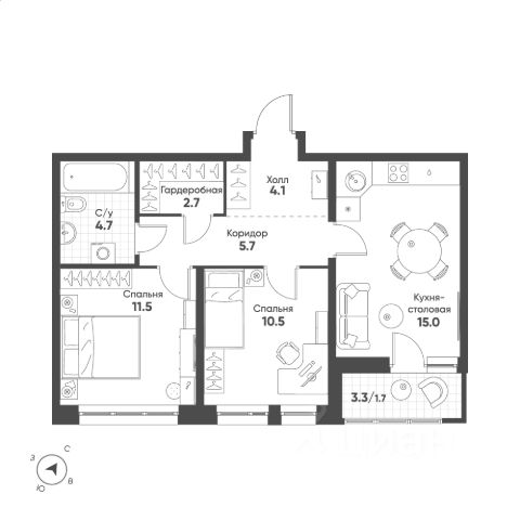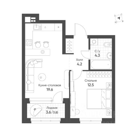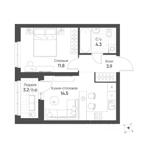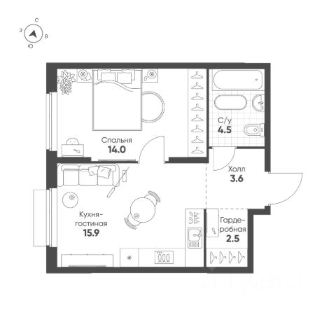 Удачная планировка: просторная кухня-гостиная площадью 14,5 м2 с выходом на лоджию, жилая комната площадью 11,6 м2, совмещенный санузел и вместительный коридор с нишой для хранения !