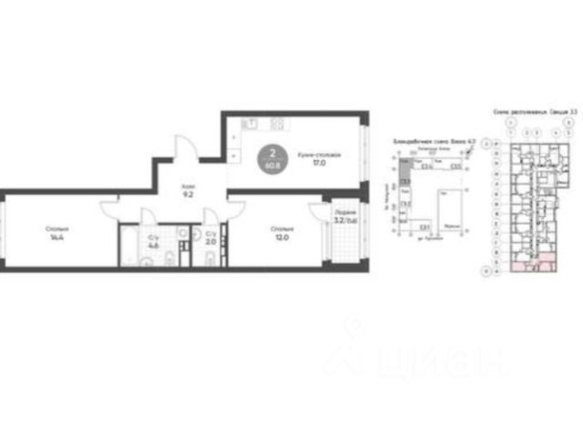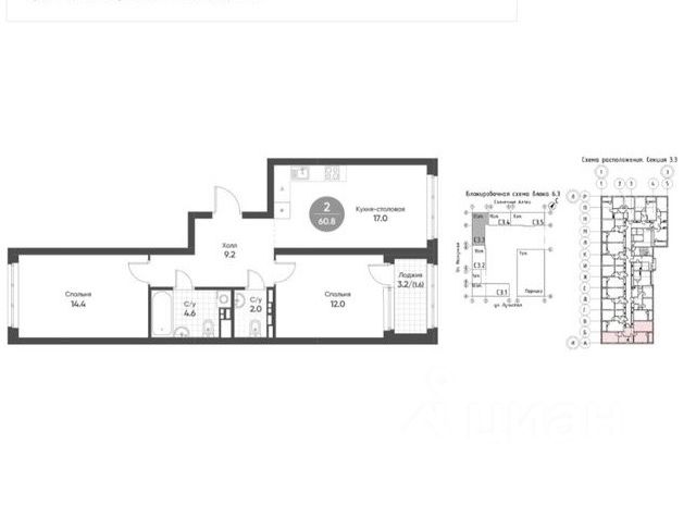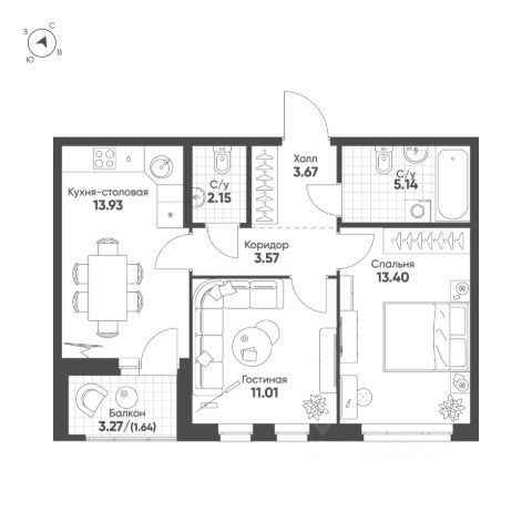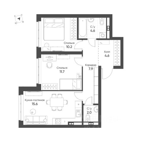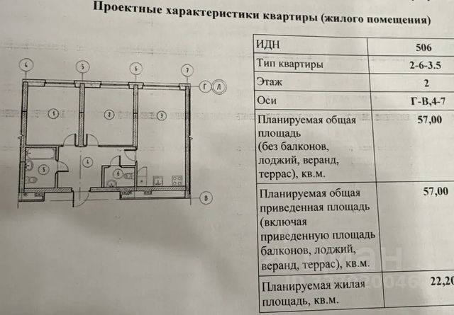 Общая площадь составляет 57,2 квадратных метров, включая две комнаты площадью 10,30 и 10,20 кв. м., кухню-столовую 18,90 кв.м., совмещённый санузел - 4,40 кв. м., санузел - 1,80 кв. м., коридор - 11,60 кв.м; высота потолков достигает 2,72 метра. Внутренняя отделка предусматривает подготовку стен и полов перед финишной отделкой. Из окон открывается вид на променадную улицу.