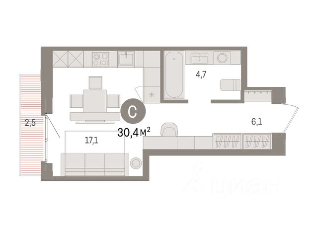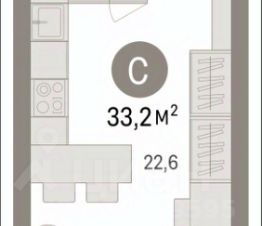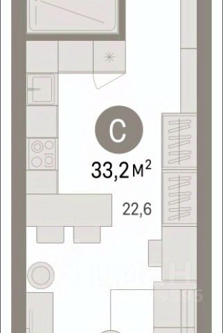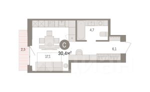 Однокомнатная студия с предчистовой отделкой в ЖК "Квартал Траектория" на 13 этаже. Общая площадь: 30.4 кв.м., площадь гостиной 22.1 кв.м., из которых 5 кв.м. выделено под кухонную зону. Все окна выходят на одну сторону. В квартире один балкон, один совмещенный санузел. Высота потолков 2.82 м.