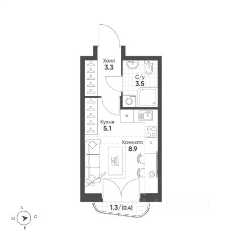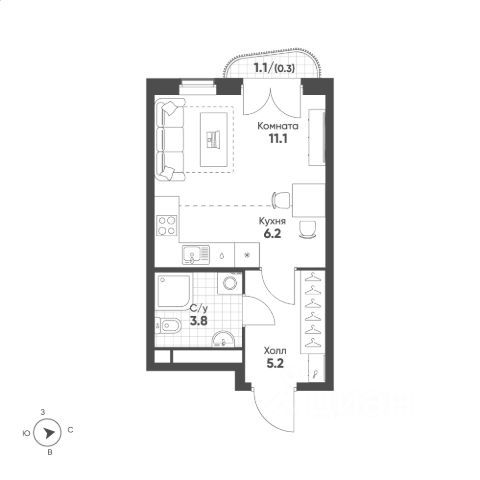 Удачная планировка: просторная кухня-гостиная площадью 14,5 м2 с выходом на лоджию, жилая комната площадью 11,6 м2, совмещенный санузел и вместительный коридор с нишой для хранения !