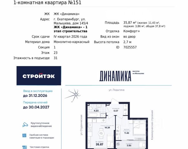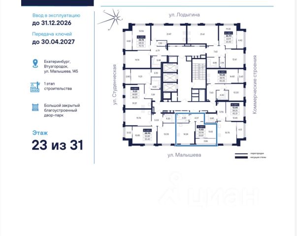 Эргономичная квартира-студия с лоджией и перспективой роста в цене — отличный выбор для тех, кто делает первые шаги к самостоятельной жизни. Общая площадь квартиры 27,9 кв.м., и ее умная планировка позволяет создать атмосферу, полностью отражающую ваши стиль и предпочтения. Квартира располагается в ЖК "Комсомольский" — жилом комплексе комфорт-класса. Здесь вы будете наслаждаться беззаботной жизнью, ведь ваш дом — воплощение практичности, безопасности и надежности. Для удобства предусмотрены колясочные на первых этажах домов, где можно оставить велосипеды и коляски в тепле. За безопасность отвечают система электронных ключей и видеонаблюдение. Еще здесь собственная котельная, поэтому в доме всегда будут горячая вода и оплата счетов только за фактически потребленное тепло. ПРЕИМУЩЕСТВА ЖК Красивые и функциональные парадные с мягкой и стильной зоной для отдыха, книгообменником, встроенными почтовыми ящиками и нишами для сумок Колясочные с доступом по ключу IP-домофоны Тихие лифты с плавным ходом О ПРОЕКТЕ ЖК "Комсомольский" строится в спокойном Кировском районе Екатеринбурга в границах улиц Сыромолотова — Рассветная — 40-лет Комсомола. Комплекс состоит из трех домов переменной этажности, которые выделяются динамичными линиями, выразительными фасадами и стильными лоджиями. ЛОКАЦИЯ Всё, что необходимо для повседневной жизни, находится недалеко от дома: школы, детские сады, продуктовые магазины, фитнес-клубы. Дорога до центра города на машине займет всего 10 минут — достаточно повернуть с улицы 40-летия Комсомола на улицу Владимира Высоцкого. Рядом с этим перекрестком начинается "Тропа здоровья" — большой терренкур вдоль "Каменных палаток". 10 мин до центра 3-4 минуты до школы No 82, гимназии No 176 4-5 минут до детских садов No 208, No 583, 266 20 мин до Свердловского областного медицинского колледжа и Центральной городской больницы No 7 В рамках стратегического развития района на первых этажах домов появятся коммерческие помещения, в которых откроются магазины и кафе. Следует учесть, что к 2030 году в Кировском районе планируется формирование регионального рекреационно-оздоровительного кластера, строительство ветки метро, расширение и модернизация старых промышленных зон социальной и бизнес-инфраструктуры, что приведет к созданию комфортной среды для жизни. Кроме того, в стратегию входит развитие Шарташского лесного парка как центра регионального и международного туризма. СПОСОБЫ ПОКУПКИ Ипотека: подберем выгодные условия в нескольких банках, чтобы вы могли выбрать лучшее Материнской капитал: можно использовать в качестве первоначального взноса Рассрочка: платите частями без % Сертификаты: позволяют оплатить часть стоимости квартиры О КОМПАНИИ "Паритет Девелопмент" — это современный и ответственный подход к реализации проектов в сфере жилищного строительства. Компания ф