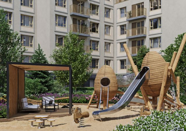 Мы закроем дворы от машин, чтобы создать безопасную среду для отдыха. Применим натуральные материалы в отделке малых архитектурных форм — дерево, камень, металл без лишней обработки. Внутри каждого двора — детские площадки, перголы с тенистыми зонами, мягкие газоны и места для общения с со