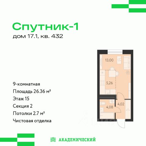 Продаётся квартира площадью 26.02 м2 в жилом комплексе "Эхо леса". Квартира находится на 15 этаже, жилая площадь квартиры 13.40 м2, площадь кухни-ниши — 5 м2. Срок сдачи — I кв. 2028 Жилой комплекс "Эхо леса" — это: - дом в эко-стиле - двор с выходом в лесопарк - лаконичная архитектура - развитая инфраструктура вокруг квартала Инфраструктура В окружении проекта — вся необходимая инфраструктура: детские сады, школы, спортивный комплекс, продуктовые магазины, аптеки, кофейни, рестораны и салоны красоты. Благоустройство Концепция двора-парка продолжает тему леса. Ландшафт с продуманным всесезонным озеленением дополняют акценты: сухой ручей из камней, столы и навесы из натурального дерева, эко-тропы, фонтан и променад. Для взрослых предусмотрены пешеходные и велодорожки, для детей — игровые площадки для разных возрастов. Архитектура Переменная высота секций создаёт выразительный архитектурный облик. На фасадах — игра контрастных, при этом природных оттенков. Динамики зданию придают текстуры материалов: фактурной штукатурки и клинкерного кирпича. Лобби Интерьер в холле продолжает концепцию квартала и выполнен в эко стиле. В отделке используются элементы природных материалов с изображениями листвы и деревьев. Паркинг Тёплый подземный паркинг организован как единое пространство с собственным дизайном. Кладовые Индивидуальные помещения на техническом этаже — способ сохранить пространство в квартире. Попасть в кладовые можно на лифте. Планировки В продуманных планировках выделены тихие и шумные зоны. Приватные спальни и кабинеты спрятаны от маршрутов домашнего движения, а кухни-гостиные с барной стойкой вместо стены — всегда готовы к семейным праздникам. Из окон квартир открываются живописные виды на лес.
