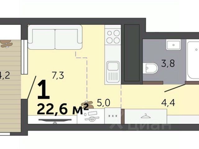 Новая кваpтиpa с уникальным расположением на этаже, современной планировкой формата студии и остекленной лоджией.