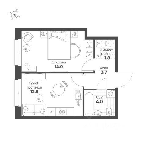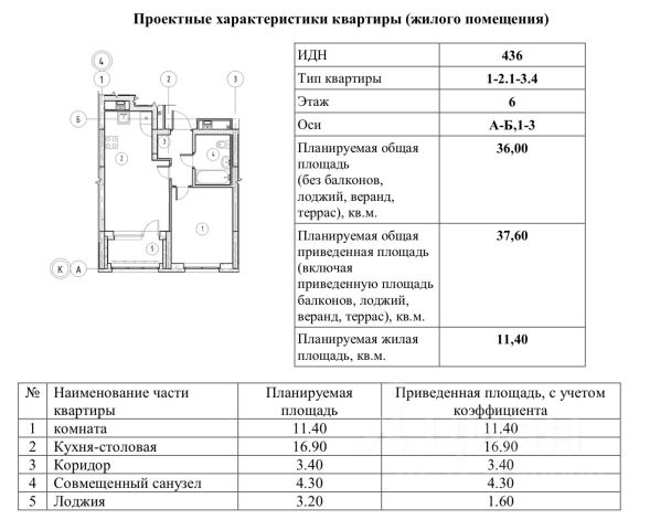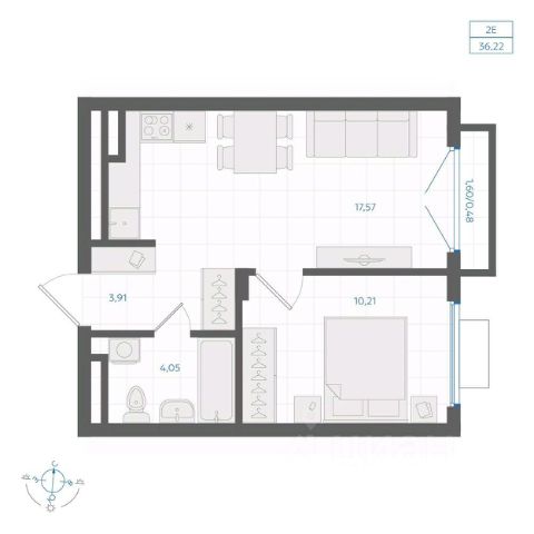 Общая площадь составляет 57,2 квадратных метров, включая две комнаты площадью 10,30 и 10,20 кв. м., кухню-столовую 18,90 кв.м., совмещённый санузел - 4,40 кв. м., санузел - 1,80 кв. м., коридор - 11,60 кв.м; высота потолков достигает 2,72 метра. Внутренняя отделка предусматривает подготовку стен и полов перед финишной отделкой. Из окон открывается вид на променадную улицу.