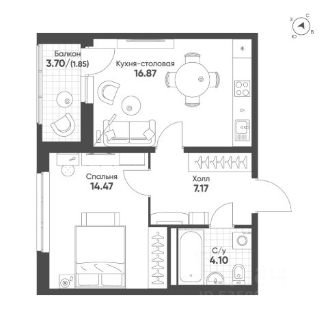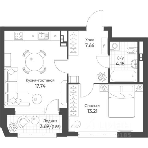 Удачная планировка: просторная кухня-гостиная площадью 14,5 м2 с выходом на лоджию, жилая комната площадью 11,6 м2, совмещенный санузел и вместительный коридор с нишой для хранения !