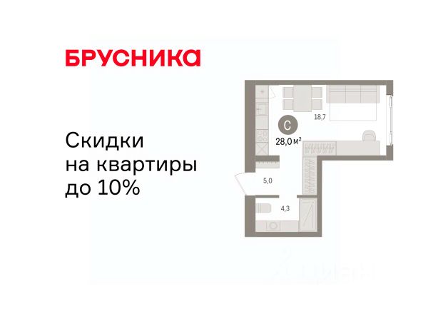 1-комн. студия от застройщика с предчистовой отделкой в ЖК "Квартал Траектория" на 2 этаже. Общая площадь: 28 кв.м. Высота потолков 2.82 м.