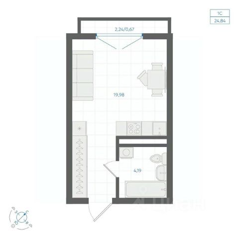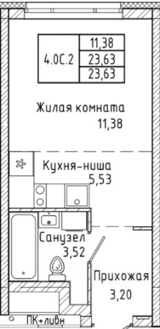 Просторная однокомнатная квартира-студия с предчистовой отделкой в ЖК "Соната Парк" на 4 этаже. Общая площадь: 33.72 кв.м., площадь гостиной 17.29 кв.м., из которых 5.88 кв.м. выделено под кухонную зону. Все окна выходят на одну сторону. В квартире один балкон, один совмещенный санузел. Высота потолков 2.72 м.