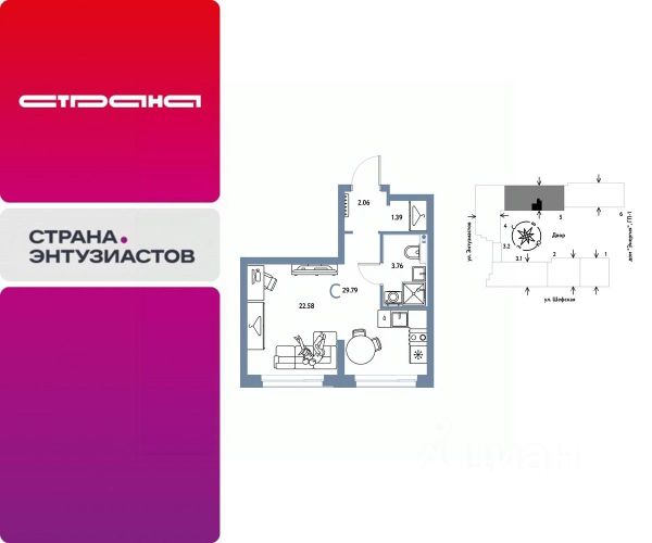 Новая квартира в ЖК "Страна.Энтузиастов" напрямую от федерального застройщика "Страна Девелопмент". Продается студия на 9 этаже от застройщика Страна Девелопмент. Площадь квартиры 37,24 кв. м. ЖК "Страна.Энтузиастов" Жилой комплекс "Страна.Энтузиастов" — это уютный квартал на севере Екатеринбурга, в центре Эльмаша. Здесь органично соединяются природа и умные технологии. Главной точкой притяжения станет "зелёная" городская гостиная, которая объединит жителей района. А значимой социальной особенностью проекта выступит муниципальный детсад на 100 мест. Преимущества • Городская гостиная для отдыха жителей и гостей — мы вдохновились энергией народной стройки и огромным желанием сделать свой дом лучше и уютнее. Ведь в середине ХХ века на Эльмаше кипела заводская жизнь, лился металл, инженеры и рабочие. • У каждого дома свой приватный двор окружен "зеленью", которая будет цвести весь год. Двор мы разделили на несколько зон: для детей младшего и среднего возраста, релакс пространство с гамаками и подвесными креслами, спортивная зона с воркаут и настольным теннисом. • На первых этажах находятся торговые и офисные помещения. В них располагаются полезные сервисы для жителей: рестораны, магазины, пекарни, кофейни, аптеки, салоны красоты и пункты выдачи заказов. Для каждого помещения спроектирован отдельный вход, витражное остекление и место под вывеску. Отделка Квартиры сдаются с предчистовой отделкой: произведена разводка электричества и отопления, выполнена стяжка пола, стены выровнены "под маяк", установлены радиаторы. Дизайнерская отделка При покупке квартиры в ЖК "Страна.Энтузиастов" можно включить стоимость ремонта в ипотеку. 4 стиля отделки ванной и 5 стилей отделки комнат на выбор. Кухня от застройщика Одна из удобных опций от Страны — приобретение кухни в ипотеку при покупке опции "Ремонт". Доступно 4 стиля на выбор: дерево, керамика, мрамор, бетон. Умный дом Система "Умный дом" создаст новый уровень комфорта. Управление светом с помощью голоса, получение последней информации о ситуации в квартире во время отпуска или рабочего дня — и другие преимущества включены в пакет. Способы покупки Сотрудники "Страна Девелопмент" будут сопровождать вас на каждом этапе сделки, помогут получить одобрение по ипотеке или снизить ежемесячный платеж. - ипотека - рассрочка - с использованием материнского капитала -100% оплата наличными