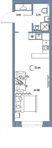 Общая площадь 34,8 м. кв. + лоджия 8,8 м.кв.