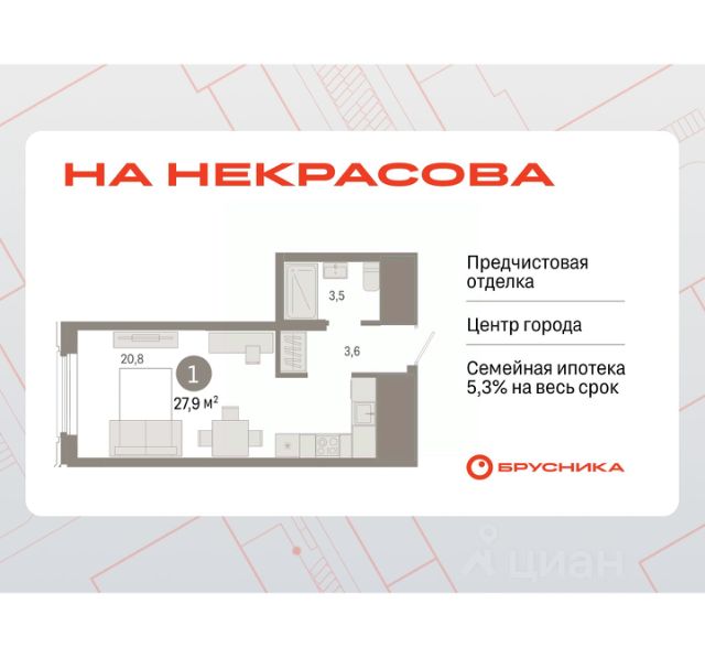 Просторная 1-комн. студия с предчистовой отделкой в ЖК "Квартал Траектория" на 11 этаже. Общая площадь: 35.1 кв.м., площадь гостиной 25.4 кв.м., из которых 5 кв.м. выделено под кухонную зону. Все окна выходят на одну сторону. В квартире один балкон, один совмещенный санузел. Высота потолков 2.82 м. Дом монолитный, многоподъездный, переменной этажности, от 7 до 25 этажей. Квартира находится в 3-й секции высотой 16 этажей в корпусе 1-1. На этаже 7 квартир. В подъезде 1 пассажирский и 1 грузовой лифт. Начало строительства - 4 квартал 2025 года. Окончание строительства - 4 квартал 2027 года. Оформление сделки по договору долевого участия. Студия в квартале "Траектория". Особенности планировки: балкон, предчистовая отделка. квартиры в нашей базе: МНВ01-Ж3.11.3. Квартал "Траектория" строится в границах улиц Билимбаевской, Расточной, Монтажников и Маневровой Раньше здесь находился оборонный завод 5-ЦАРЗ, основанный в 1945 году. После войны он ремонтировал военную и грузовую технику — от "Виллисов" и "Студебекеров" до советских ЗИС-5 и ГАЗ-67. Сортировка — район с развитой инфраструктурой, обжитыми жилыми кварталами разных эпох и большим количеством парков. До центра Екатеринбурга — 20 минут на машине. Туда же можно отправиться на автобусе: ближайшая остановка общественного транспорта — в 4 минутах от "Траектории". Рядом с "Траекторией" расположены магазины, торговый центр, детские сады, школы, поликлиники и полезные сервисы, а также другой проект Брусники — квартал "Депо". Если хочется развлечений, можно отправиться в ТРЦ "Карнавал" и парк с аттракционами "Таганская слобода" — дорога туда займёт не более 10 минут на машине. Квартал "Траектория" — первый этап комплексного развития территории, которую раньше занимали производственные здания. На месте бывших цехов Брусника создаст дружелюбную среду и комфортное пешеходное пространство для всего района. Для озеленения квартала мы подобрали больше 60 видов растений: ольху, липу, клён, иву, грушу, вишню, сирень, барбарис, гортензию, смородину, ирис, декоративные травы. Они цветут в разное время года и постоянно меняют настроение двора. В "Траектории" мы предусмотрели несколько общественных пространств, открытых для всех горожан: встречающий сквер, лесопарк у храма и событийный сквер между домами. Когда захочется тишины и уединения, можно устроить прогулку во внутренних дворах: в них нет машин и посторонних, зато много зелени, света и мест для отдыха. Каждый двор в квартале "Траектория" — продолжение квартиры, только под открытым небом. Здесь можно прогуляться босиком по траве, устроить утреннюю йогу, почитать книгу в гамаке или отправить детей поиграть, не переживая за их безопасность. Мы закроем дворы от машин, чтобы создать безопасную среду для отдыха. Применим натуральные материалы в отделке малых архитектурных форм — дерево, камень, металл без лишней обработки. Внутри каждого двора — детские площадки, перголы с тенистыми зонами, мягкие газоны и места для общения с соседями. #zMgz
