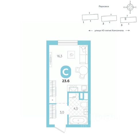 Эргономичная квартира-студия с лоджией и перспективой роста в цене — отличный выбор для тех, кто делает первые шаги к самостоятельной жизни. Общая площадь квартиры 21,7 кв.м., и ее умная планировка позволяет создать атмосферу, полностью отражающую ваши стиль и предпочтения. Квартира располагается в ЖК "Комсомольский" — жилом комплексе комфорт-класса. Здесь вы будете наслаждаться беззаботной жизнью, ведь ваш дом — воплощение практичности, безопасности и надежности. Для удобства предусмотрены колясочные на первых этажах домов, где можно оставить велосипеды и коляски в тепле. За безопасность отвечают система электронных ключей и видеонаблюдение. Еще здесь собственная котельная, поэтому в доме всегда будут горячая вода и оплата счетов только за фактически потребленное тепло. ПРЕИМУЩЕСТВА ЖК Красивые и функциональные парадные с мягкой и стильной зоной для отдыха, книгообменником, встроенными почтовыми ящиками и нишами для сумок Колясочные с доступом по ключу IP-домофоны Тихие лифты с плавным ходом О ПРОЕКТЕ ЖК "Комсомольский" строится в спокойном Кировском районе Екатеринбурга в границах улиц Сыромолотова — Рассветная — 40-лет Комсомола. Комплекс состоит из трех домов переменной этажности, которые выделяются динамичными линиями, выразительными фасадами и стильными лоджиями. ЛОКАЦИЯ Всё, что необходимо для повседневной жизни, находится недалеко от дома: школы, детские сады, продуктовые магазины, фитнес-клубы. Дорога до центра города на машине займет всего 10 минут — достаточно повернуть с улицы 40-летия Комсомола на улицу Владимира Высоцкого. Рядом с этим перекрестком начинается "Тропа здоровья" — большой терренкур вдоль "Каменных палаток". 10 мин до центра 3-4 минуты до школы No 82, гимназии No 176 4-5 минут до детских садов No 208, No 583, 266 20 мин до Свердловского областного медицинского колледжа и Центральной городской больницы No 7 В рамках стратегического развития района на первых этажах домов появятся коммерческие помещения, в которых откроются магазины и кафе. Следует учесть, что к 2030 году в Кировском районе планируется формирование регионального рекреационно-оздоровительного кластера, строительство ветки метро, расширение и модернизация старых промышленных зон социальной и бизнес-инфраструктуры, что приведет к созданию комфортной среды для жизни. Кроме того, в стратегию входит развитие Шарташского лесного парка как центра регионального и международного туризма. СПОСОБЫ ПОКУПКИ Ипотека: подберем выгодные условия в нескольких банках, чтобы вы могли выбрать лучшее Материнской капитал: можно использовать в качестве первоначального взноса Рассрочка: платите частями без % Сертификаты: позволяют оплатить часть стоимости квартиры О КОМПАНИИ "Паритет Девелопмент" — это современный и ответственный подход к реализации проектов в сфере жилищного строительства. Компания ф