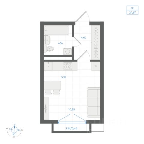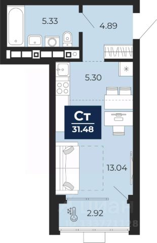 Однокомнатная квартира-студия с предчистовой отделкой в ЖК "Соната Парк" на 30 этаже. Общая площадь: 31.48 кв.м., площадь гостиной 18.34 кв.м., из которых 5.3 кв.м. выделено под кухонную зону. Все окна выходят на одну сторону. В квартире один балкон, один совмещенный санузел. Высота потолков 2.72 м.