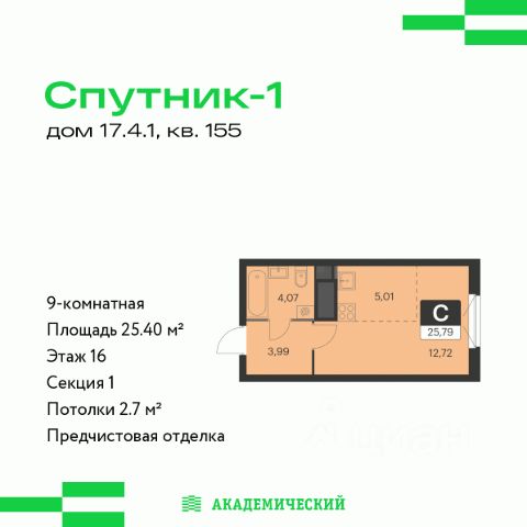 В экологически чистом районе Широкой Речки, всего в 10 км от центра Екатеринбурга, продается студия площадью 29.00 кв. м. с предчистовой отделкой. Квартира находится в 3 корпусе жилого комплекса комфорт-класса "ЛЕС" (Застройщик - компания "Железно").