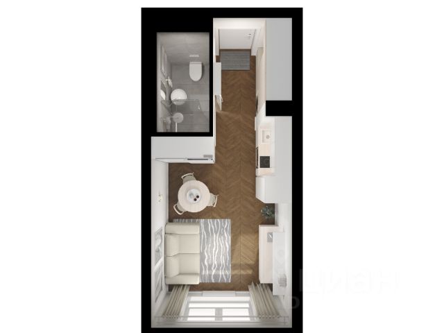 1-комн. студия с предчистовой отделкой в ЖК "Квартал Траектория" на 3 этаже. Общая площадь: 30.7 кв.м., площадь гостиной 18.7 кв.м., из которых 5 кв.м. выделено под кухонную зону. Все окна выходят на одну сторону. В квартире один балкон, один совмещенный санузел. Высота потолков 2.82 м.