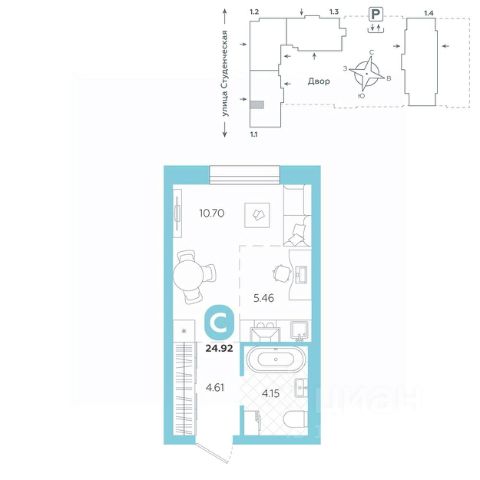 Квартира-студия на 10 этаже с балконом. Окна выходят во двор. Чистовая отделка под ключ. Дом в 15 минутах от центра города. Рядом остановки общественного транспорта, школы и детские сады.