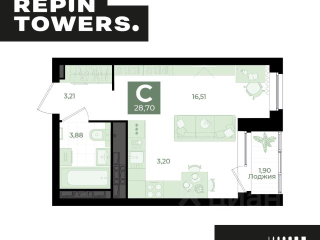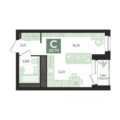 Новая кваpтиpa с уникальным расположением на этаже, современной планировкой формата студии и остекленной лоджией.