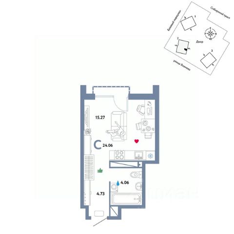Студия в квартале "Траектория". Особенности планировки: предчистовая отделка, балкон.