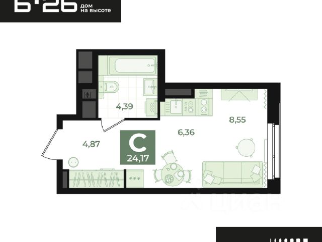 Квартира-студия на 8 этаже с балконом. Окна выходят во двор. Чистовая отделка под ключ. Дом в 15 минутах от центра города. Рядом остановки общественного транспорта, школы и детские сады.