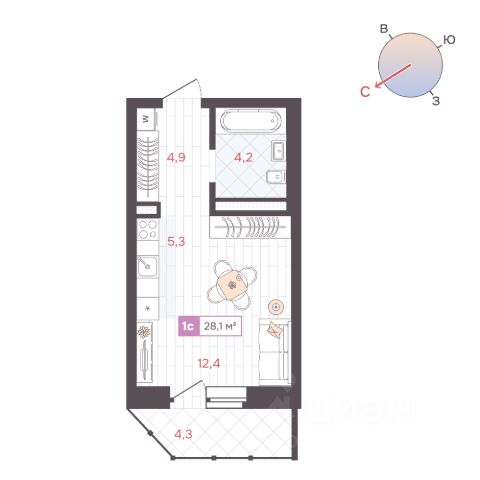 Продается однокомнатная квартира-студия от застройщика с предчистовой отделкой в ЖК "Соната Парк" на 4 этаже. Общая площадь: 33.72 кв.м., площадь гостиной 17.29 кв.м., из которых 5.88 кв.м. выделено под кухонную зону. Все окна выходят на одну сторону. В квартире один балкон, один совмещенный санузел. Высота потолков 2.72 м.