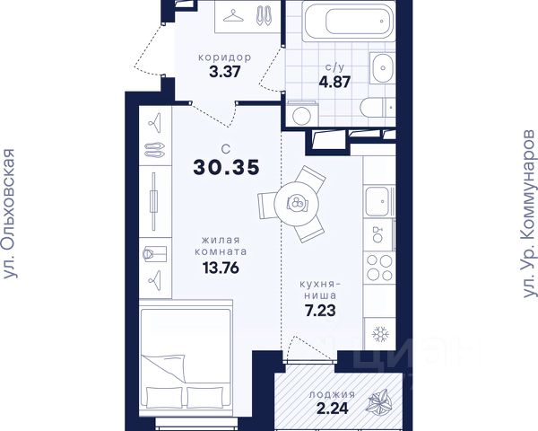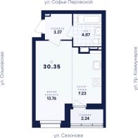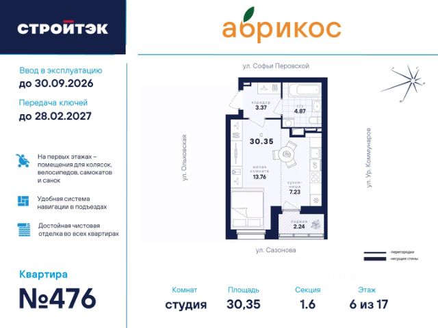 ЖК "Абрикос", расположен в районе Новая Сортировка по адресу ул. Софьи Перовской, д. 106а. Познакомьтесь с "Абрикосом" поближе. Мы создали его таким, чтобы вы были довольны всем, а ваша жизнь в нём была как сам этот фрукт: свежей, сочной, яркой и солнечной. Район Тихий микрорайон Новая сортировка на Северо-западе Екатеринбурга. 20 минут пешком до парка "Таганская слобода" 15 минут на машине до кольцевой дороги, а до центра — полчаса даже по пробкам 10 минут на машине до ТЦ "Карнавал" 7 школ и 11 детсадов поблизости 6 продуктовых магазинов рядом Двор Во дворе хорошо должно быть всем: детям — площадки по возрасту, взрослым — прогулочные дорожки. Но это не всё. Вместительная парковка вокруг ЖК Концепция "Двор без машин", когда можно заехать только для разгрузки и погрузки Закрытая территория с пропускной системой Круглосуточное видеонаблюдение и освещение территории в ночное время Стритбольная площадка Подъезды Не подъезд, а парадная. Так говорят в Петербурге, но и в "Абрикосе" это слово приходит в голову. Просторные холлы с витражами и достойной отделкой. Доступ в подъезды на уровне земли — без барьеров Домофоны — в тёплых остеклённых тамбурах В каждом подъезде — грузопассажирский лифт Помещения для колясок и самокатов на 1 этаже Удобная навигация с номерами этажей и квартир Планировки Наш подход к проектированию называется "Разумные метры". Это значит не только исходить из площади, но и учитывать число жильцов и их потребности. Объединённые кухни-гостиные для простора и общения 3D-модели с вариантами обстановки Отказ от бесполезных "мёртвых" зон Отделка В ЖК "Абрикос" мы позаботились о чистовой отделке, чтобы ваш переезд прошёл быстро и не вызвал лишних хлопот. На полу в комнатах, прихожих и кухнях — прочный водостойкий ламинат, в санузлах — керамическая плитка, потолки — натяжные Межкомнатные двери и усиленная сейф-дверь на входе в квартиру В санузлах установлены раковины и унитазы, а во всей квартире — розетки и выключатели Радиаторы с терморегуляторами и горизонтальной разводкой, двухкамерные стеклопакеты с приточными клапанами вентиляции Продам квартиру-студию в микрорайоне Новая Сортировка в городе Екатеринбург.