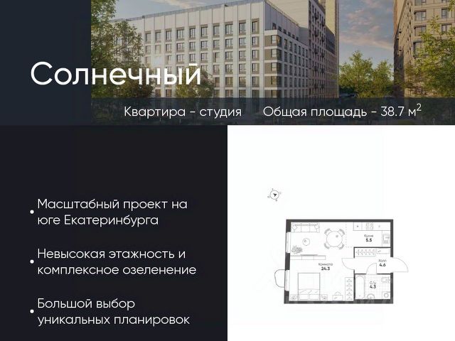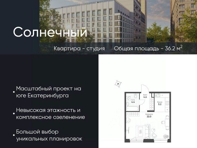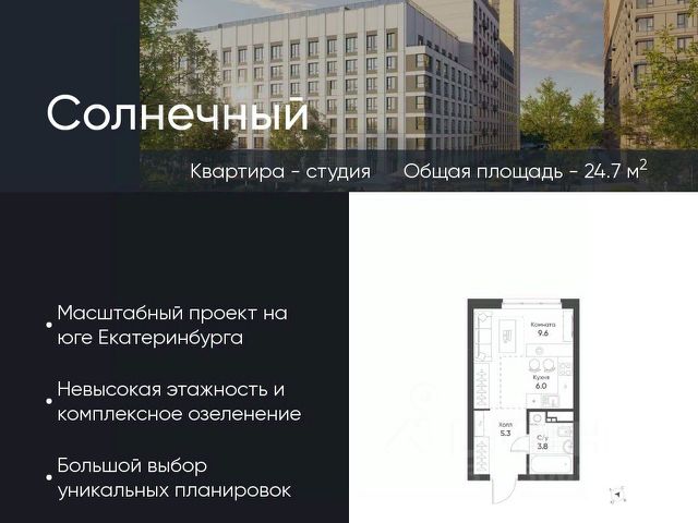 СДЕЛКА ДО КОНЦА ОКТЯБРЯ. Далее предложения не будет. Только у застройщика за 5.800.000+ Студия в готовом районе Солнечный - 15 этаж, лоджия, отличная планировка! КОРПУС 6.3 (ул. Лучистая - Нескучная) Площадь: 24,7 Этаж: 15 из 16 Состояние: Под чистовую (готово к ремонту под себя) Форма продажи: Переуступка Преимущества квартиры: — Удачная планировка: просторная прихожая с нишей под шкаф, санузел с местом под полноценную ванну — Вид с высокого этажа — Подготовка под ремонт: стены выровнены, сделана стяжка, установлена входная дверь, проведено отопление и электрическая разводка О районе Солнечный: Здесь уже живут люди, а не только строятся дома. — 3 детских сада — Центр художественной и эстетической гимнастики прямо в шаговой доступности от корпуса — Губернаторский лицей — Парки, бульвары, аллеи, детские и спортивные площадки - всё уже есть — Круглосуточное видеонаблюдение на территории Транспортная доступность: - Остановка Центр художественной гимнастики - 3 минуты пешком - Остановка Золотистый бульвар - 5 минут - Выезд на ЕКАД - 4 минуты на авто — До центра Екатеринбурга - 2025 минут Почему стоит брать сейчас: - Таких планировок практически не осталось - Цена выгоднее, чем у застройщика - Район уже развит - можно спокойно жить или выгодно сдавать Пишите или звоните - расскажу все детали и помогу с переуступкой!