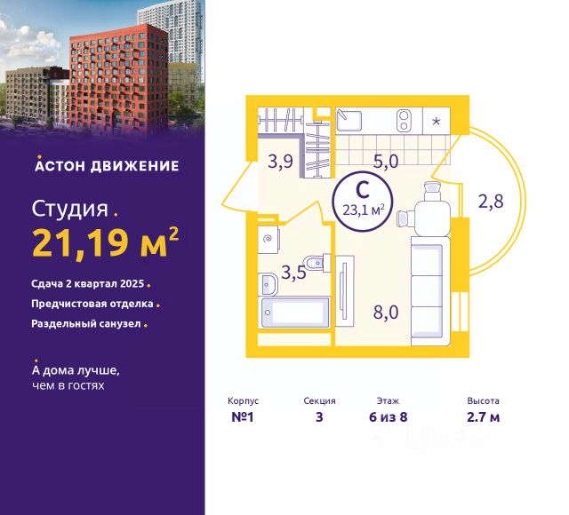 Продается квартира С ОТДЕЛКОЙ в современном жилом квартале "Движение" новый жилой комплекс комфорт-класса в развивающейся части Новой Сортировки, расположенный на пересечении улицы Пехотинцев и переулка Проходной. В 1 минуте от супермаркета, рядом образовательные и медицинские учреждения, парки. 20 минут до центра города. В продаже 1 дом 1 очереди (три секции от 8 до 12 этажей). Срок сдачи 4 квартал 2025 года Доступна ипотека 14% для всех! Преимущества квартир: - Есть квартиры с теплыми лоджиями; - Эргономичная и функциональная планировка; - Качественная чистовая отделка: входные двери, ламинат, обои под покраску, установлена сантехника; - Горизонтальная разводка систем отопления свободные стены; - Счетчики на э/э, воду и тепло ежемесячная экономия на коммунальных платежах; - Сделаны входы для слаботочных сетей (интернет, телефон, цифровое телевидение). Преимущества дома: - Кулуарность низкоэтажных секций; - Много окон, света и воздуха; - Детский сад со своей территорией внутри проекта; - Свой приватный зеленый двор с мультивозрастными площадками; - Ритейл на первом этаже дома; - Образовательные, медицинские и спортивные учреждения в пешей доступности; - Развитая инфраструктура рядом — магазины, пункты выдачи и пр.; - 6 минут до семейного парка "Таганская слобода" и до парка-стадиона "Локомотив" на автомобиле; - 20 минут до центра города на автомобиле. Продается квартира-студия в микрорайоне Старая Сортировка в городе Екатеринбург.