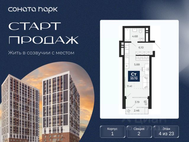 Спешите забронировать по акционной цене! Предложение ограничено! Стоимость квартиры указана со скидкой, ваша экономия составит 100,000 RUB. Информация по телефону, мы вам все подробно расскажем! Просторная 1-комн. квартира-студия с предчистовой отделкой в ЖК "Соната Парк" на 2 этаже. Общая площадь: 28.59 кв.м., площадь гостиной 16.89 кв.м., из которых 5.02 кв.м. выделено под кухонную зону. Все окна выходят на одну сторону. В квартире один балкон, один совмещенный санузел. Высота потолков 2.72 м. Дом монолитный, трехподъездный, переменной этажности, от 10 до 24 этажей. Квартира находится в 1-й секции высотой 10 этажей в корпусе 2. На этаже 5 квартир. В подъезде 1 пассажирский и 1 грузовой лифт. Окончание строительства - 4 квартал 2028 года. Оформление сделки по договору долевого участия. ЖК "Соната Парк" расположен в новом городском кластере "Аллея Романтиков" на Юго-Западе Екатеринбурга. Это район улиц Волгоградская Советских женщин Шаумяна Амудсена. Аллея объединяет разные кварталы застройщиков этой территории в единое целое. Чистые линии, интеллектуальная элегантность фасадов, игра света и тени это партитура, написанная архитектором. Благоустройство жилого комплекса это синтез искусства и природы. Поющие музыкальные инсталляции и поэтический променад. Оркестр растений: сирень, гортензии и яблони, чья цветущая палитра сменяется в течение года. Жизнь с готовой инфраструктурой Развитая транспортная доступность и социальная среда: уже сегодня рядом с домом детские сады, школы, парковые зоны, супермаркеты и рестораны в шаговой доступности. Технологии безопасности Для спокойствия жителей создана интеллектуальная система безопасности. Круглосуточный визуальный контроль обеспечивают профессиональная служба охраны, постоянно присутствующая на территории, и ситуационный центр. Система видеонаблюдения охватывает каждый уголок комплекса, исключая "слепые" зоны. Чёткое зонирование и навигация дополняют картину полного порядка. Дизайнерские подъезды Стилистика подъездов продолжает концепцию "Соната Парка", вдохновлённого музыкальной симфонией: сдержанный, но при этом впечатляющий дизайн соседствует с удобством и функциональностью. В подъезде вас встречает музыка, создавая особую атмосферу с первых секунд. Светлые и стильные входные группы с панорамным остеклением наполняют пространство светом, добавляя ему современной эстетики и ощущения безопасности. Аллея Романтиков Проект органично вписан в масштабный пешеходный кластер "Аллея Романтиков" — уникальное общегородское пространство, которое уже сегодня называют будущей альтернативой главным прогулочным улицам города. Это многофункциональный бульвар протяжённостью 1 километр, где всё создано для вдохновения и отдыха. Это "зелёное сердце" территории, которое объединит кварталы разных застройщиков в единую гармоничную среду. Здесь будут назначать свидания, гулять с семьёй, встречаться с друзьями и просто наслаждаться моментом. Линейка ремонтов Ремонт с капсульной м Продам квартиру-студию в микрорайоне Юго-Западный в городе Екатеринбург.