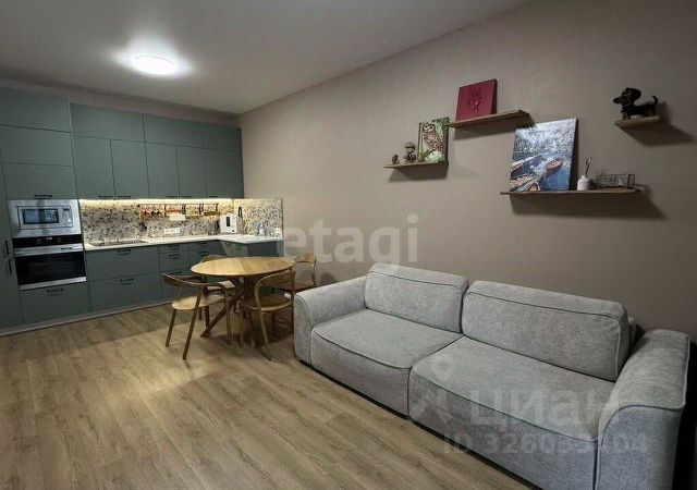 Кухонная зона оборудована гарнитуром, электроплитой со стеклокерамической варочной панелью и духовкой, вытяжкой, холодильником, в зоне гостиной на стене телевизор. В жилой комнате имеется встроенный функциональный шкаф-купе. Стены и пол в санузле облицованы керамогранитом, дорогая сантехника, сан фаянс - инсталляция. В прихожей - шкаф-купе для одежды, видеодомофон, надежная входная-сейф дверь.