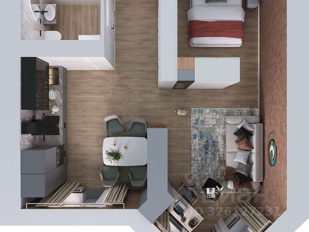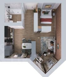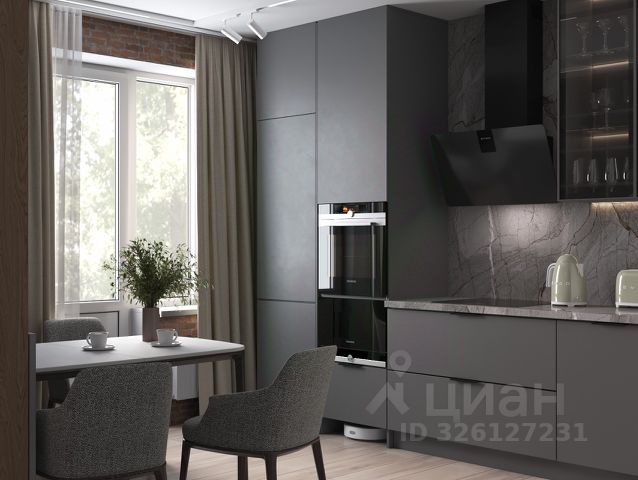 Общая плoщадь 56 м², в том числe кухня-гoстиная 30 м², жилая комната 15 м², ваннaя комнатa 6,2 м², теплая лоджия с 7,4 м². Высота потолков - 3 метра. Из окон открываются виды на улицу Куйбышева и Геологический институт.