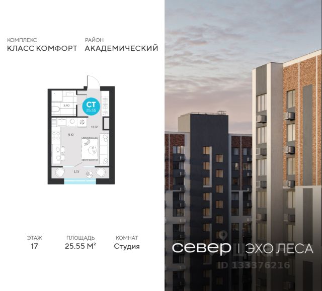 Продаётся квартира площадью 25.55 м2 в жилом комплексе "Эхо леса". Квартира находится на 17 этаже, жилая площадь квартиры 13.32 м2, площадь кухни-ниши — м2. Срок сдачи — I кв. 2028 Жилой комплекс "Эхо леса" — это: - дом в эко-стиле - двор с выходом в лесопарк - лаконичная архитектура - развитая инфраструктура вокруг квартала Инфраструктура В окружении проекта — вся необходимая инфраструктура: детские сады, школы, спортивный комплекс, продуктовые магазины, аптеки, кофейни, рестораны и салоны красоты. Благоустройство Концепция двора-парка продолжает тему леса. Ландшафт с продуманным всесезонным озеленением дополняют акценты: сухой ручей из камней, столы и навесы из натурального дерева, эко-тропы, фонтан и променад. Для взрослых предусмотрены пешеходные и велодорожки, для детей — игровые площадки для разных возрастов. Архитектура Переменная высота секций создаёт выразительный архитектурный облик. На фасадах — игра контрастных, при этом природных оттенков. Динамики зданию придают текстуры материалов: фактурной штукатурки и клинкерного кирпича. Лобби Интерьер в холле продолжает концепцию квартала и выполнен в эко стиле. В отделке используются элементы природных материалов с изображениями листвы и деревьев. Паркинг Тёплый подземный паркинг организован как единое пространство с собственным дизайном. Кладовые Индивидуальные помещения на техническом этаже — способ сохранить пространство в квартире. Попасть в кладовые можно на лифте. Планировки В продуманных планировках выделены тихие и шумные зоны. Приватные спальни и кабинеты спрятаны от маршрутов домашнего движения, а кухни-гостиные с барной стойкой вместо стены — всегда готовы к семейным праздникам. Из окон квартир открываются живописные виды на лес.