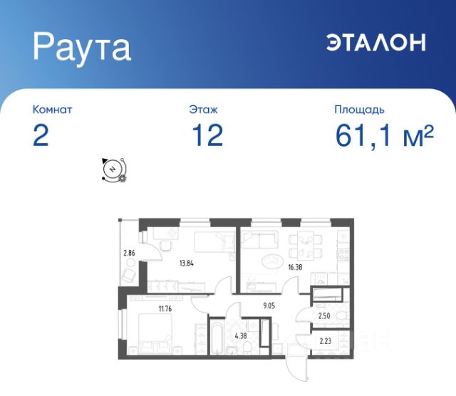 Продается 2-к квартира отделка White Box в ЖК "Раута". Общая площадь квартиры — 61.1 кв. м, этаж 12 из 25. Тип дома — монолитный. Цена указана при 100% оплате.
