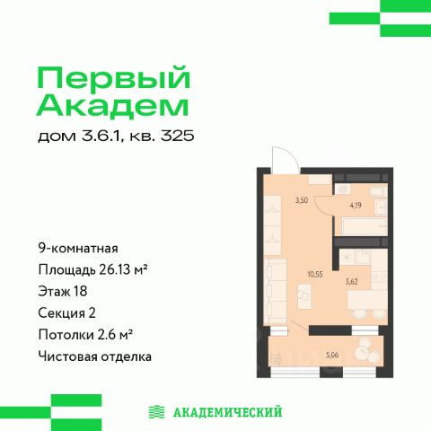Новая кваpтиpa с уникальным расположением на этаже, современной планировкой формата студии и остекленной лоджией.