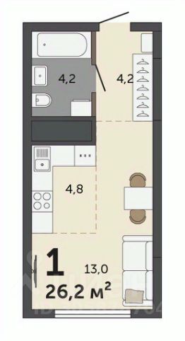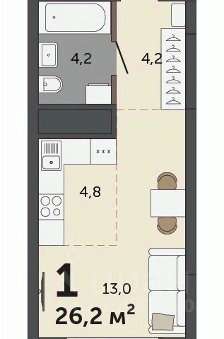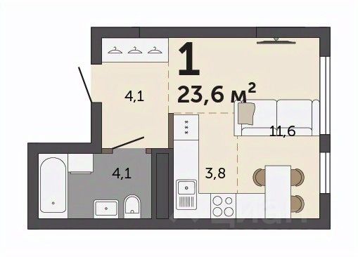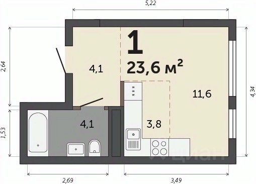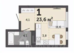 Общая площадь - 24м2, жилая - 11,4м2, кухонная зона - 3,8м2, прихожая - 4,3м2.