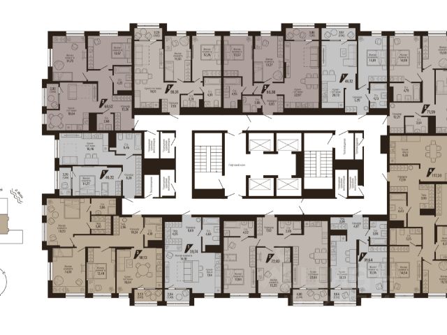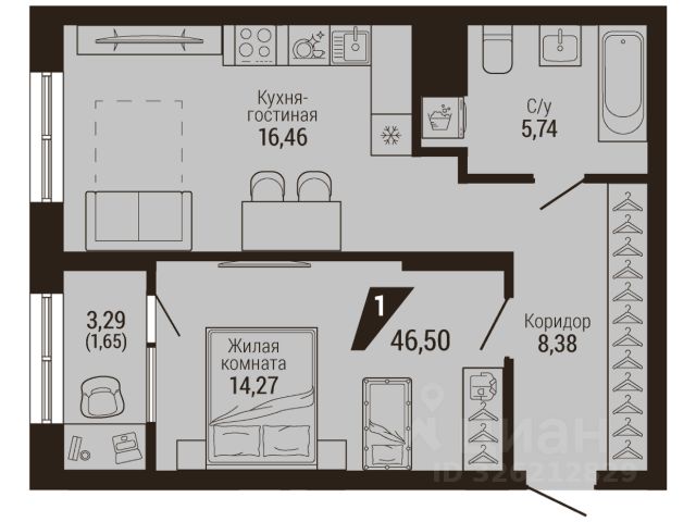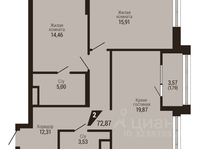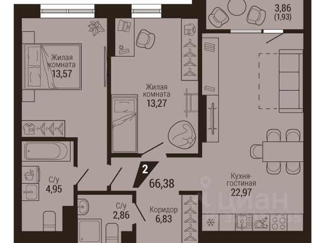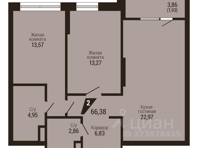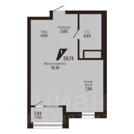 Жилая площадь 22.2 м2, кухня 5.7 м2, чистовая отделка. Раздельных санузлов - нет, балконов - нет, лоджий - нет.