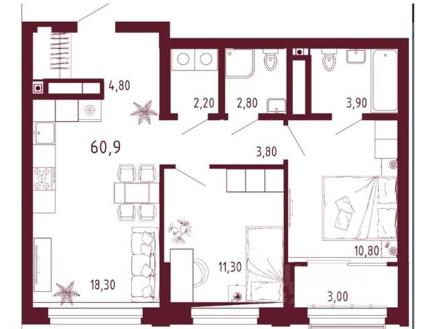 Две приятных размеров спальни (12.6 и 14.5 м2) будут ждать вас и ваших детей (если они у вас есть), чтобы подарить вам полноценный восстанавливающий отдых.