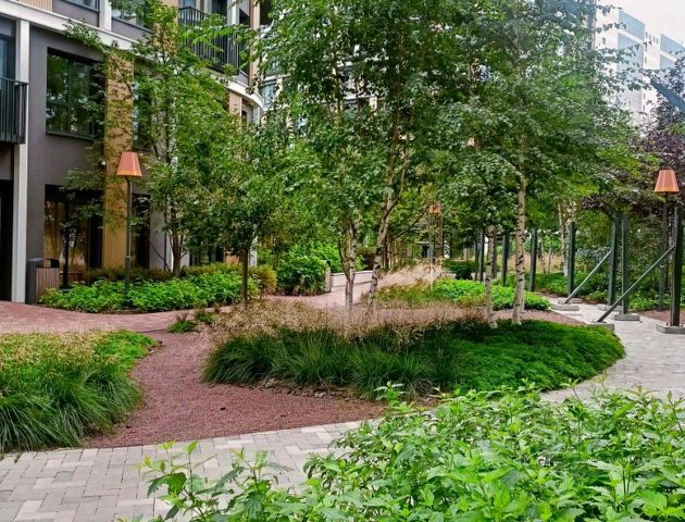 - Уникальный ландшафтный двор-парк, где каждый найдет место для отдыха и развлечений: прогулочные аллеи, окруженные зелеными насаждениями, спортивные и детские площадки, зарядные станции для гаджетов и Wi-Fi.
