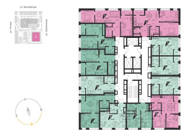 В проекте представлены студии, классические одно- и двухкомнатные варианты, а также двух-, трех- и четырехкомнатные квартиры в евроформате площадью от 25,32 до 76,65.